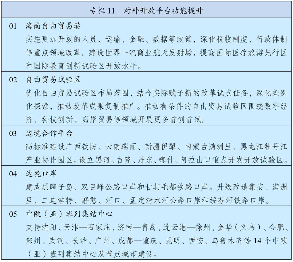 加强港澳与内地经贸、科技、人文等合作,完善便利港澳居民在内地发展和生活政策措施。有序推进与内地金融市场互联互通,深化与内地产学研创新协同。深化粤港澳合作,持续推动重点领域合作实现突破,促进港口、机场和轨道交通协同发展,建设广州至珠海(澳门)高铁,推进港深西部铁路前期工作。深化琴澳一体化发展,高质量建设前海、南沙、河套等重大合作平台。建设澳门国际机场横琴前置货站,推进澳琴国际教育(大学)城建设,支持澳门高校在横琴延伸办学。健全香港、澳门在国家对外开放中更好发挥作用机制,支持港澳深度参与高质量共建“一带一路”,发挥专业服务优势协助企业“走出去”。发挥港澳在中西文明交流互鉴中的重要窗口作用。